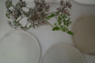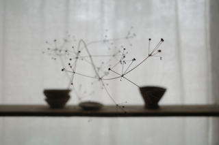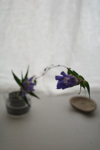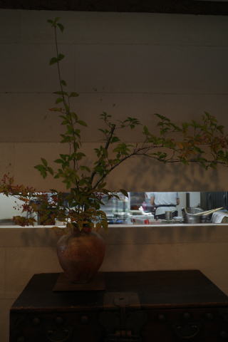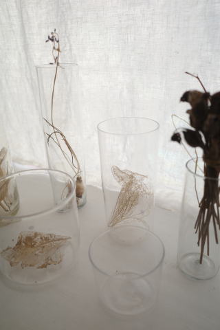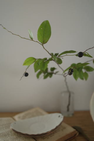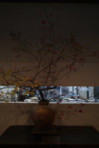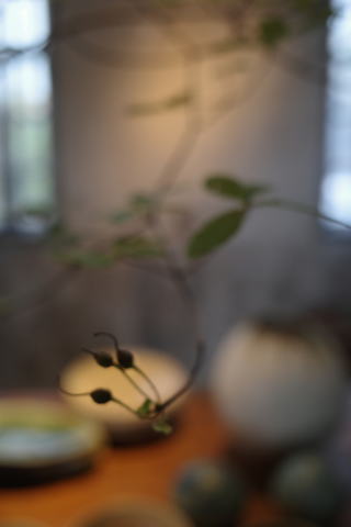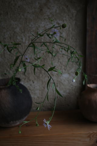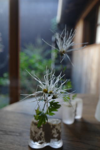 土と硝子が交わりあった器には、繊細な嵯峨菊を。